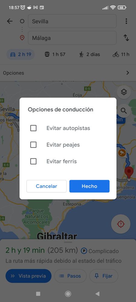 Cuando vamos a calcular la ruta a un destino Google Maps nos muestra el tiempo del trayecto con un color. Si es verde es que no hay tráfico, naranja es que hay un poco de tráfico denso, y rojo es que hay retenciones. Desplegando las indicaciones podemos ver una gráfica con la previsión del tráfico de las próximas horas. Así puedes descubrir si merecerá la pena retrasar unas horas tu viaje.