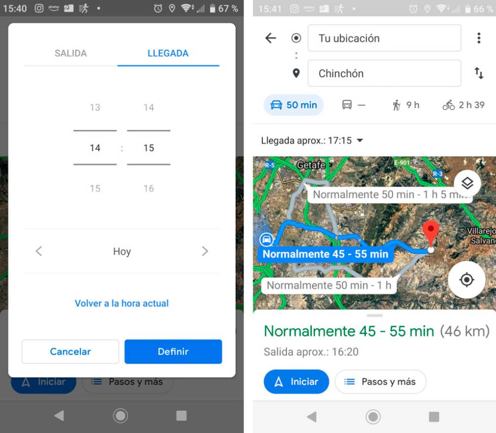 Si vas a hacer un viaje para otro día lo mejor y quieres saber ya mismo la duración que tendrá ese trayecto lo mejor es irte a Menú > Definir hora de salida o llegada. Así puedes elegir el día y hora que vas a salir o llegar. Con la hora de llegada puedes saber a qué hora tienes que salir para llegar puntualmente a tu destino.