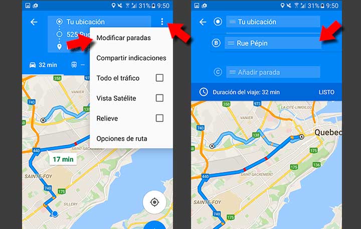En un viaje largo, lo más normal es que quieras planificar paradas como por ejemplo para ocmer, o para ver algún punto de interés en tu recorrido. Con la App de Google Maps lo podrás hacer de forma cómoda, para ello, cuando estés calculando una ruta, ve a Menú Añadir parada. Puedes añadir y organizar el orden de tus paradas. Además, también puedes añadir paradas directamente explorando las fichas de los sitios en el mapa con la opción ‘Añadir parada’.