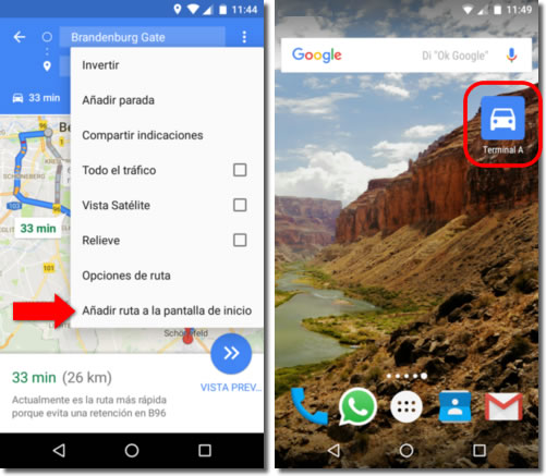 Otra carcterística interesante, y que sí permite guardar trayectos con paradas, es la opción de añadir la ruta a la pantalla de inicio. Cuando estemos calculando una ruta y tengamos ya seleccionado su trayecto y sus paradas, podemos ir a Menú > Añadir ruta a la pantalla de inicio. Se añadirá un acceso directo a la pantalla de inicio con la ruta.