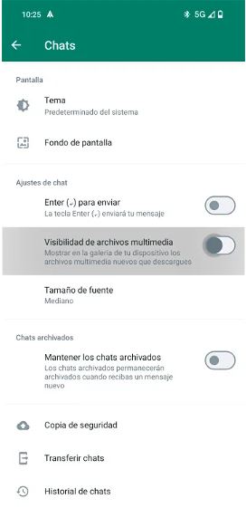 - Dentro del apartado de Chats, debes desactivar el interruptor situado a la derecha del texto «Visibilidad de archivos multimedia»